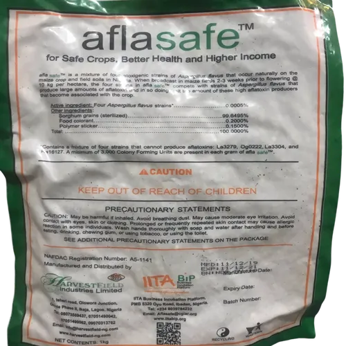 Aflasafe is a biological control product designed to prevent contamination of crops by aflatoxins, which are harmful toxins produced by Aspergillus flavus and Aspergillus parasiticus fungi.