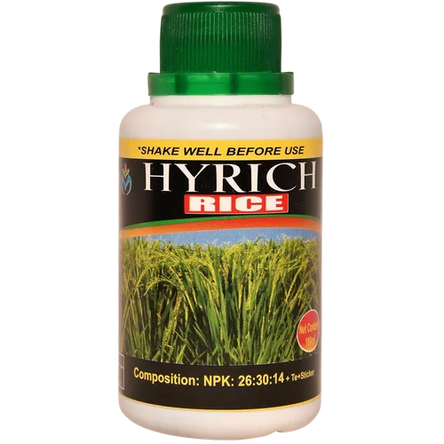 HyRich Rice (26:30:14) is a specialized liquid foliar fertilizer formulated specifically for rice crops. It contains a balanced ratio of nitrogen (N), phosphorus (P), and potassium (K), designed to enhance growth, improve flowering, and increase yield in rice cultivation.