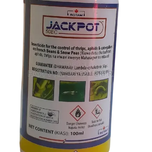 Lambda Jackpot 50EC is an insecticide formulated with Lambda-Cyhalothrin as its active ingredient. It provides effective control of various insect pests through both contact and ingestion, delivering a fast knockdown effect with lasting residual action.