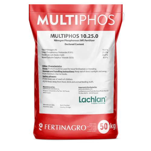 Multiphos is a granular compound fertilizer formulated to supply crops with balanced nitrogen and phosphorus, promoting robust root development and vigorous plant growth.
