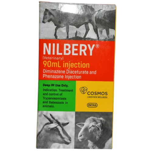 Nilbery Injection contains Diminazene, a powerful antiprotozoal drug used primarily to treat trypanosomiasis (also known as sleeping sickness) and theileriosis (East Coast fever) in livestock.