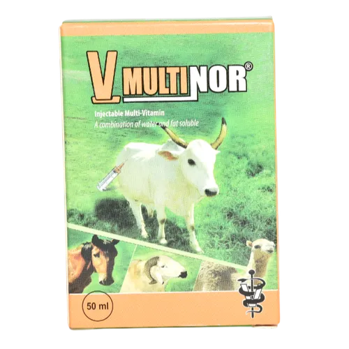 V-MULTINOR INJ is a multivitamin injection manufactured by Jubaili Agri to provide essential vitamins to livestock. It is used to correct deficiencies, improve general health, and enhance the performance of animals, especially during stress or periods of poor nutrition.
